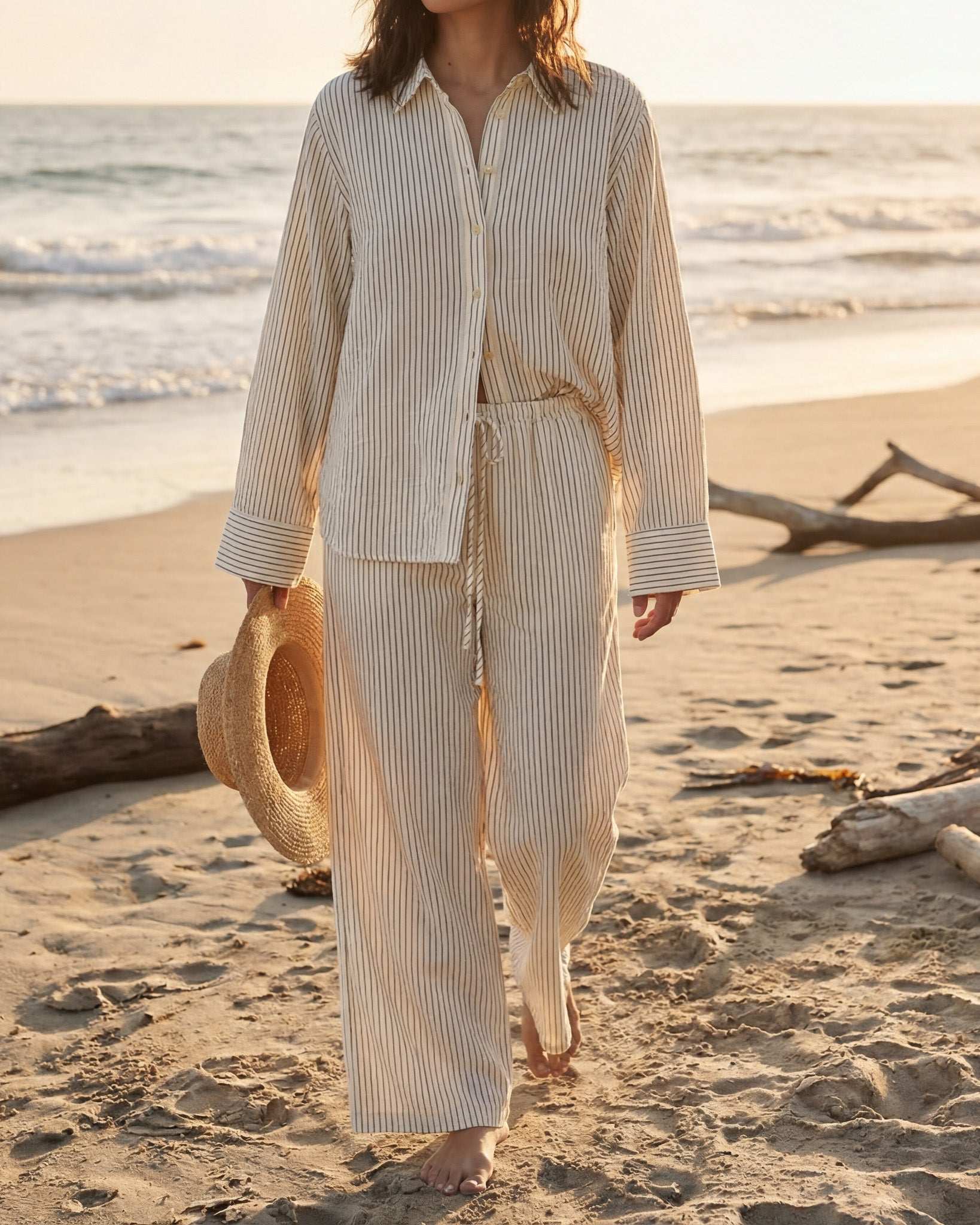 The Salt Air Striped Drawstring Pants are relaxed, lightweight, and intentionally easy. The soft elastic drawstring band, wide leg fit, and side pockets make them instant go-to.