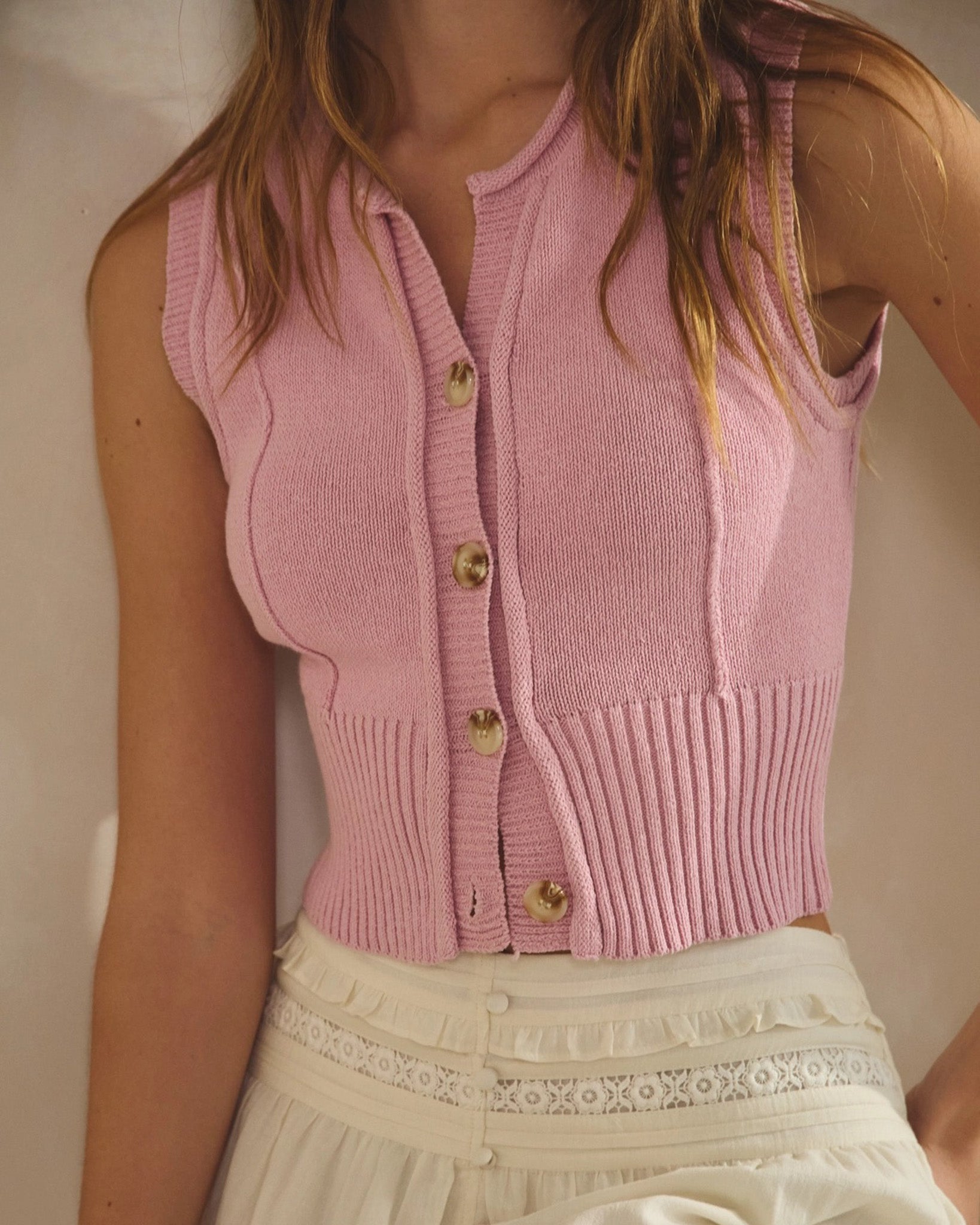 This sleeveless knit vest is structured where it matters and soft everywhere else.